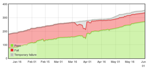 Since the introduction of Debian CI in mid-January 2014, we have seen an amazing increase in the number of packages with test suites. We had little less than 200 packages with test suites back then, against around 350 now (early June 2014). The ratio of packages passing passing their test suite has also improved a lot, going from less than 50% to more than 75%.