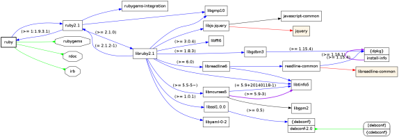 Debian is a big system. At the time of writing, looking at my local package list caches tells me that the unstable suite contains 21306 source packages, and 42867 binary packages on amd64. Between these 42867 binary packages, there is an unthinkable number of inter-package dependencies. For example the dependency graph of the ruby packages contains other 20-something packages.